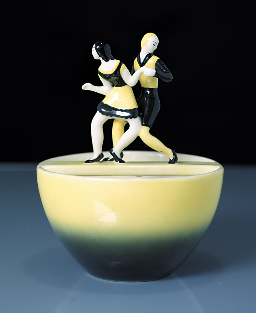 VASO PONTICELLO "DANZA SUL PONTE" IN CERAMICA, LENCI, MARIO STURANI, 1934, decoro giallo e nero, firma con anno romano fascista. Alt. cm 27.