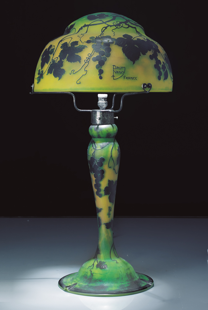 LAMPADA A CHAMPIGNON IN VETRO DOPPIO, DAUM NANCY, 1920 CA., fusto a balaustro e paralume con doppia bombatura, decoro a tralci con foglie e grappoli d'uva nei toni del bruno inciso ad acido su fondo v