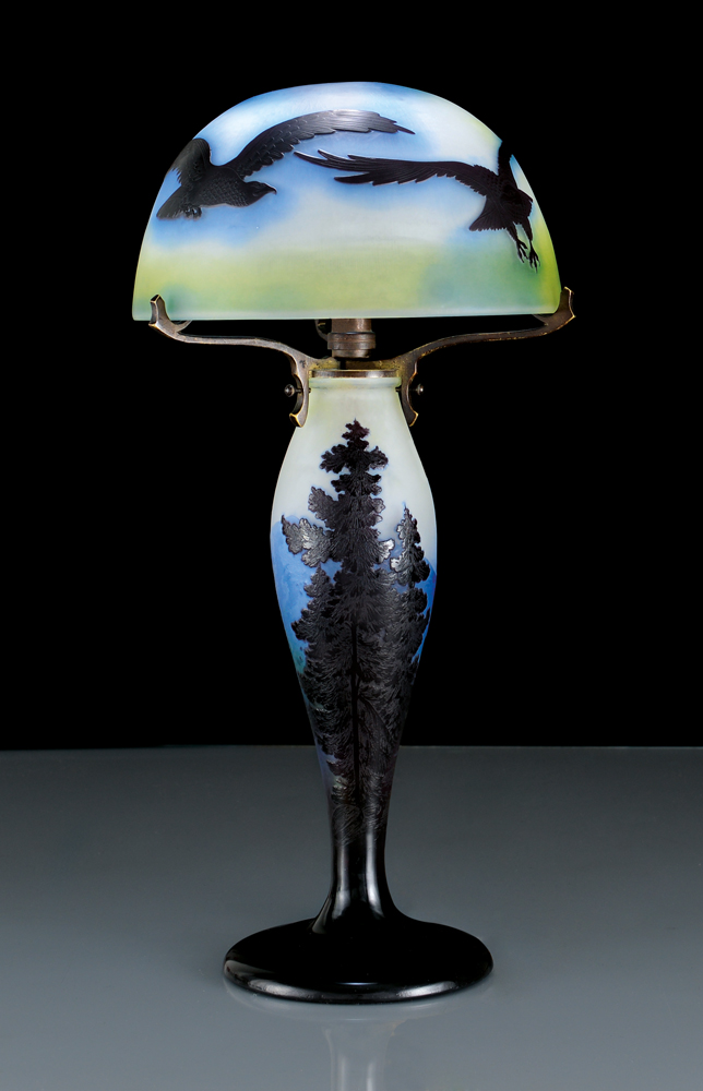 LAMPADA "A CHAMPIGNON" IN VETRO TRIPLO, GALLE', 1910 CA., fusto a balaustro e cappello a cupola, decoro a paesaggio dei Vosgi e volo di aquile nei toni del blu e del viola inciso ad acido su fondo ghi