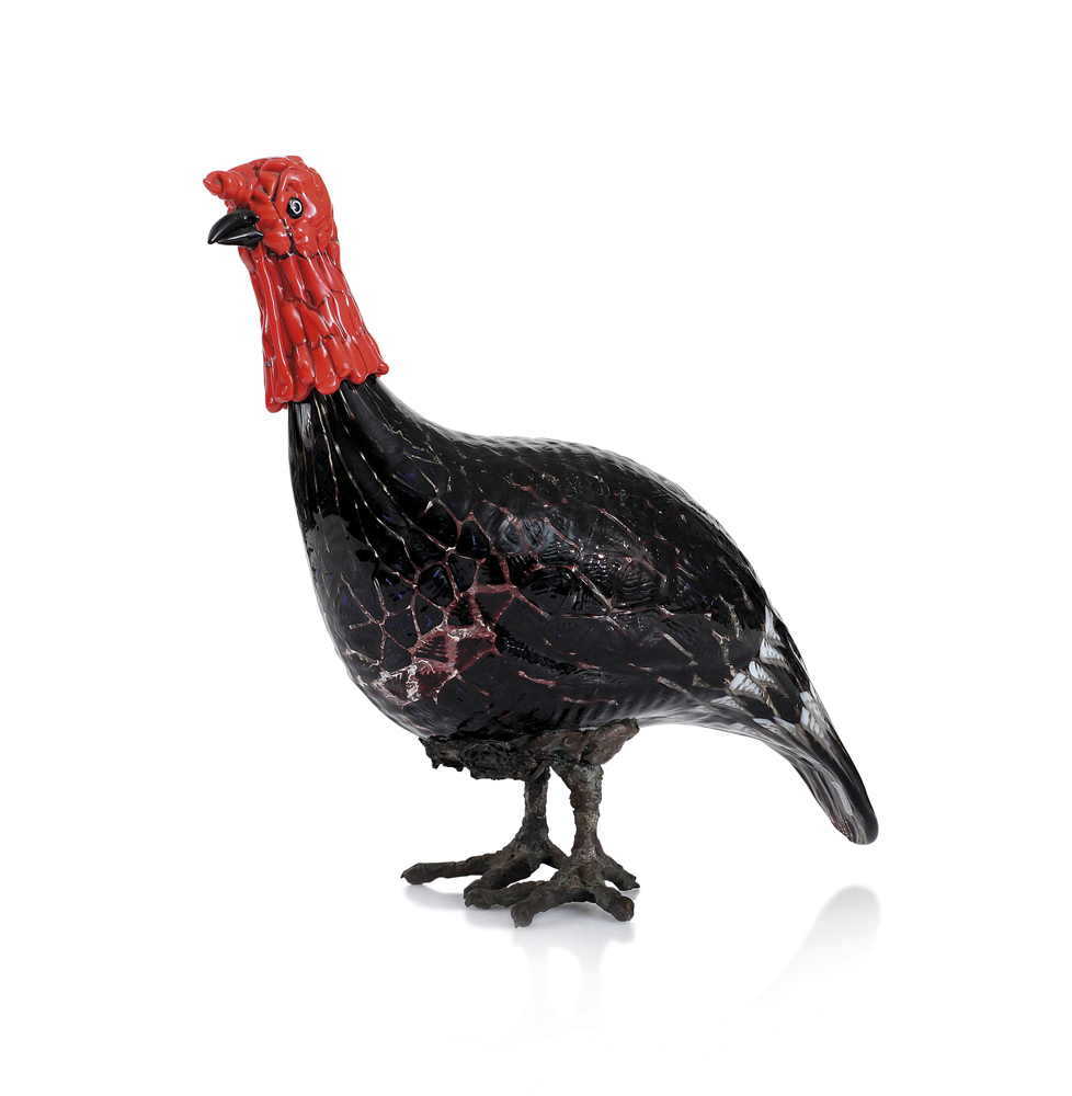 SCULTURA IN VETRO E BRONZO, VENINI, T.ZUCCHERI, ANNI '60, raffigurante tacchinella nera in vetro a murrine con testa rossa e zampe in bronzo; restauri al corpo. h 46 cm, lung. 42.