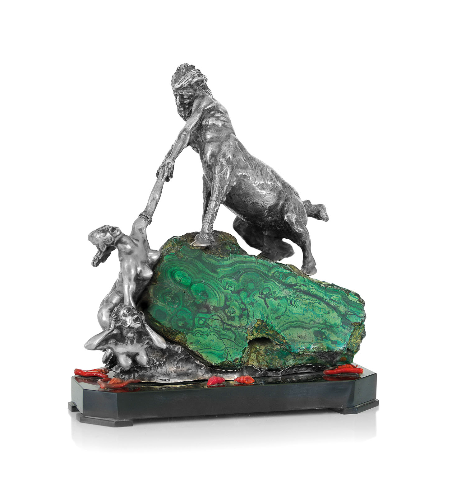 IMPORTANTE GRUPPO IN ARGENTO, MALACHITE, MARMO NERO E APPLICAZIONI IN CORALLO, ORAFO EDOARDO SARONNI, MILANO, 1920 CA., raffigurante un centauro con sirene, firmato "E.Saronni Milano". 28x20 cm h 31 t