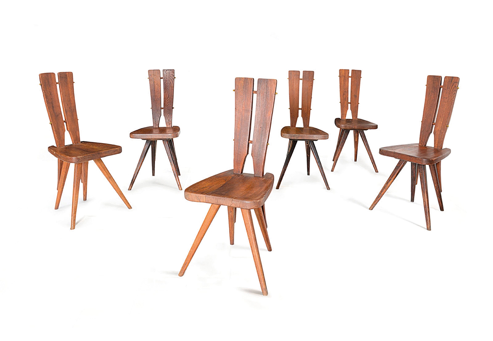 CARLO MOLLINO Rara serie di sei sedie per la Casa del Sole di Cervinia. Produzione Ettore Canali, Brescia, 1953. Struttura in legno di castagno e rovere, bulloni in ottone, schienale a doppio element
