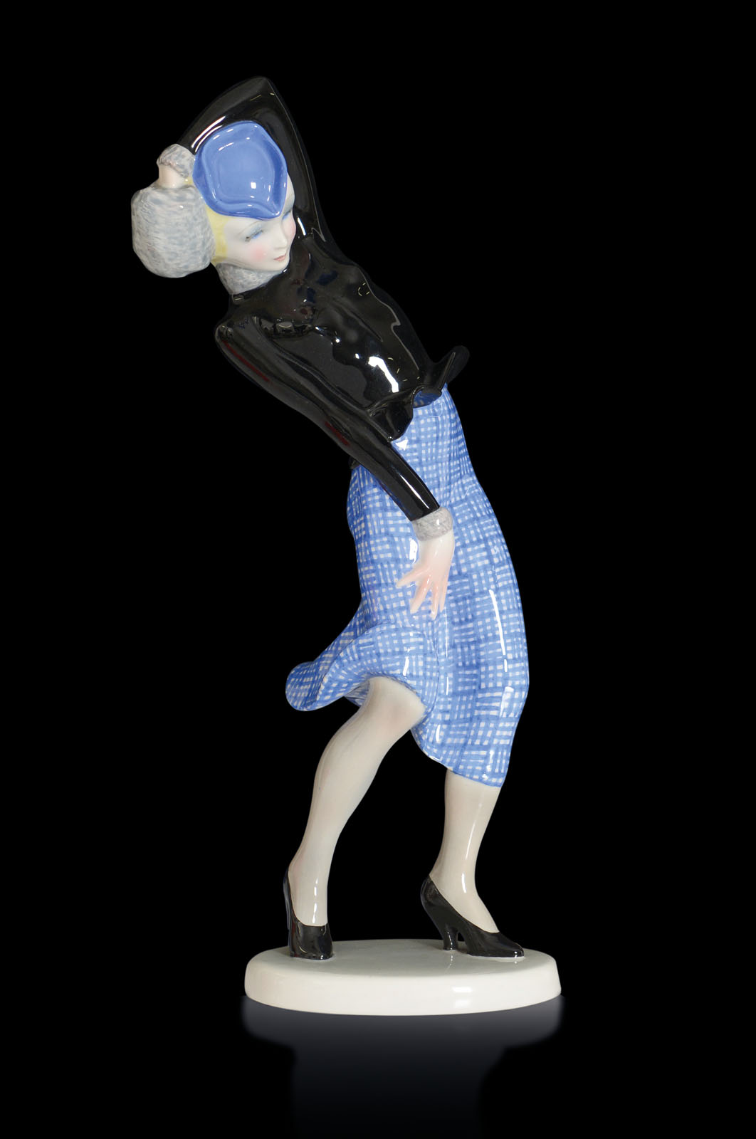 FIGURA "COLPO DI VENTO" IN CERAMICA, LENCI, H.K.SCAVINI, 1933, decoro policromo, marca e data "14-6-33-XI" sul fondo; lieve scheggiatura. h 38 cm